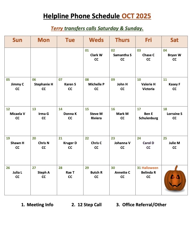- Maintains a 12 Step listing and calls individuals for 12 Step work.